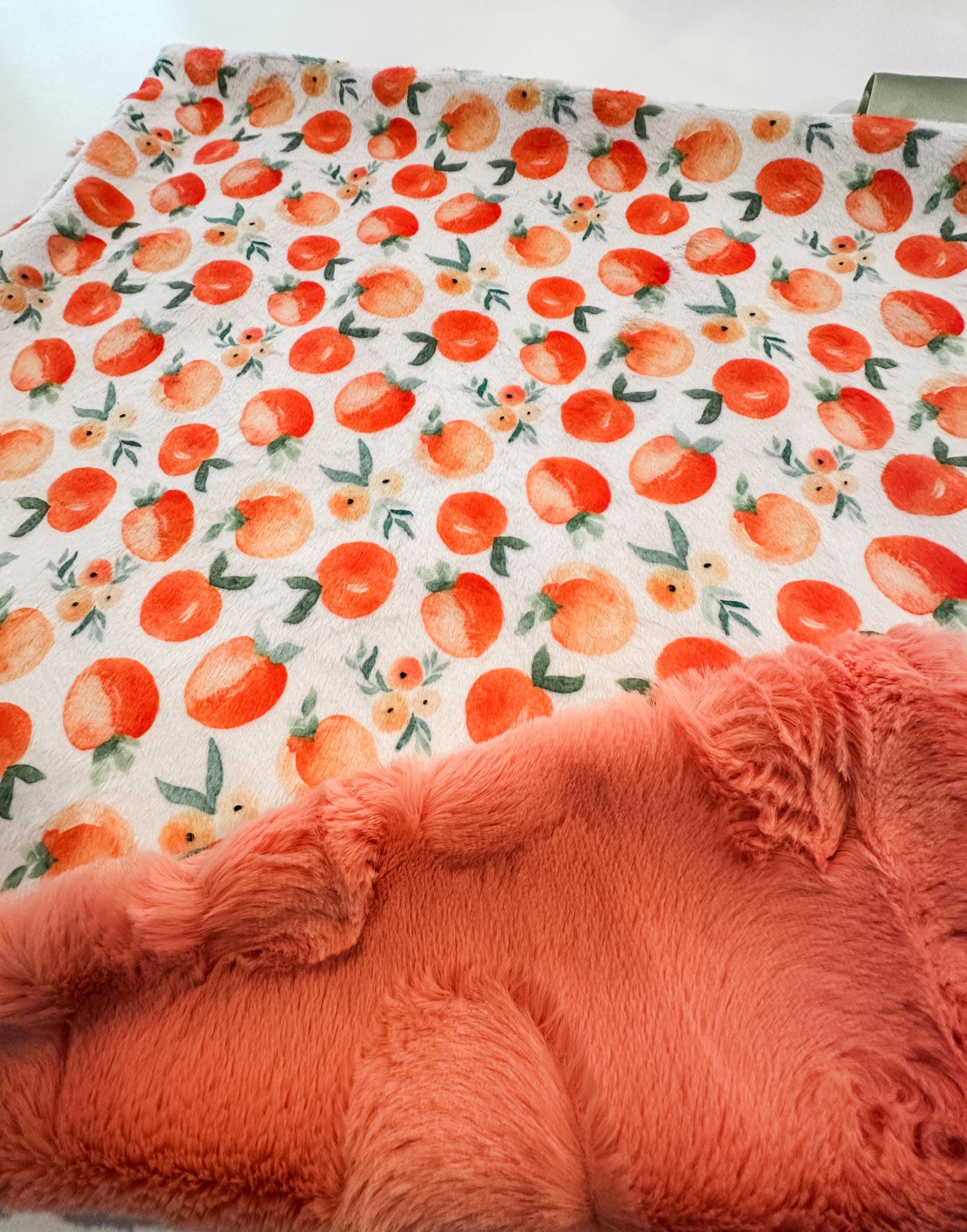 This sweet peach lovey blanket features juicy peaches printed on a lusciously soft minky fabric and backed with a super soft peach faux fur. This lovey blanket screams Summer and will quickly become a favorite!