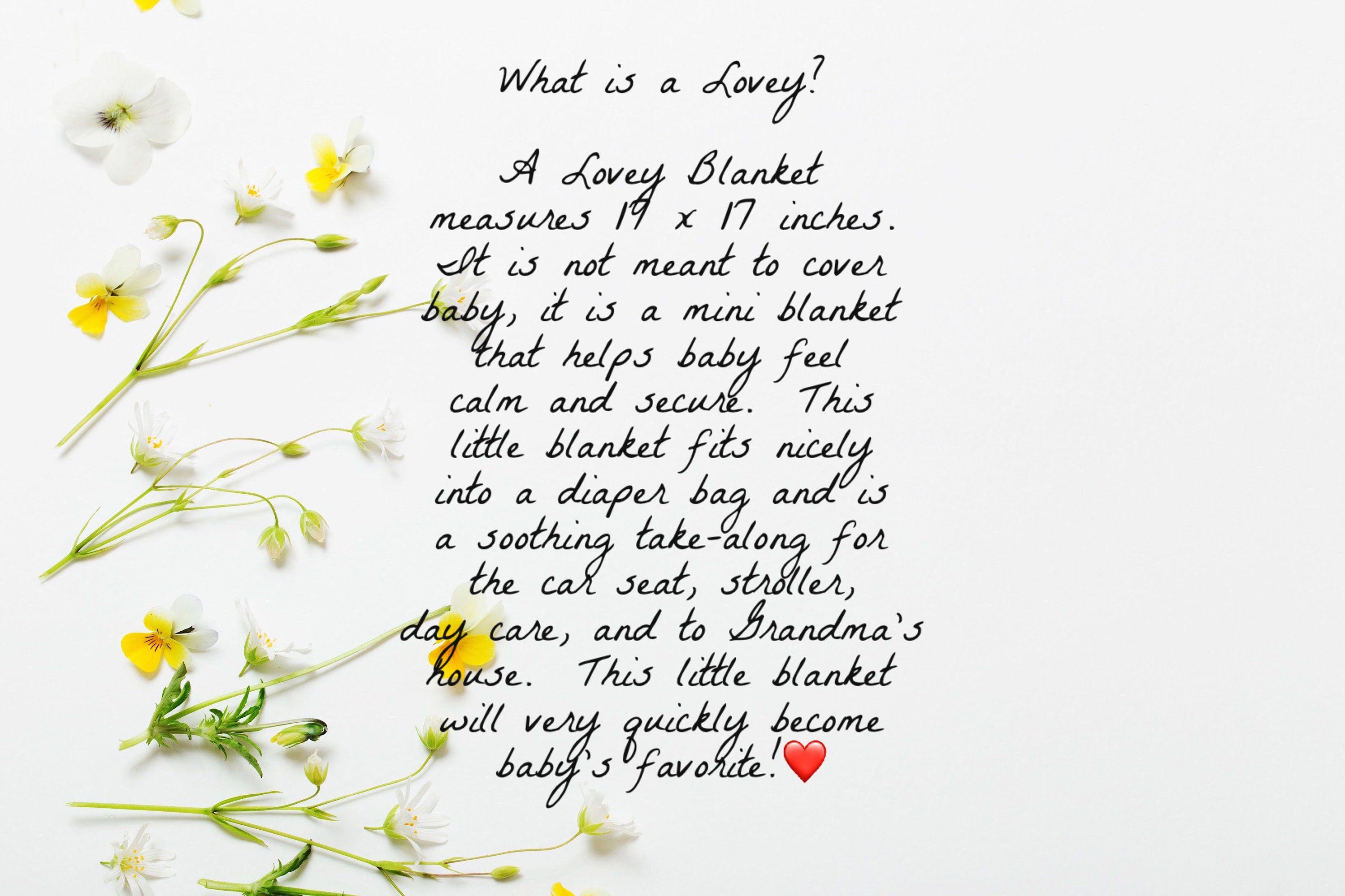 A Lovey is great for a baby or a toddler. It is the perfect size (17 x 17 inches) for the car seat, sitter, Grandma's house, NICU, reading time, sleepy time or just to make baby feel safe and secure.