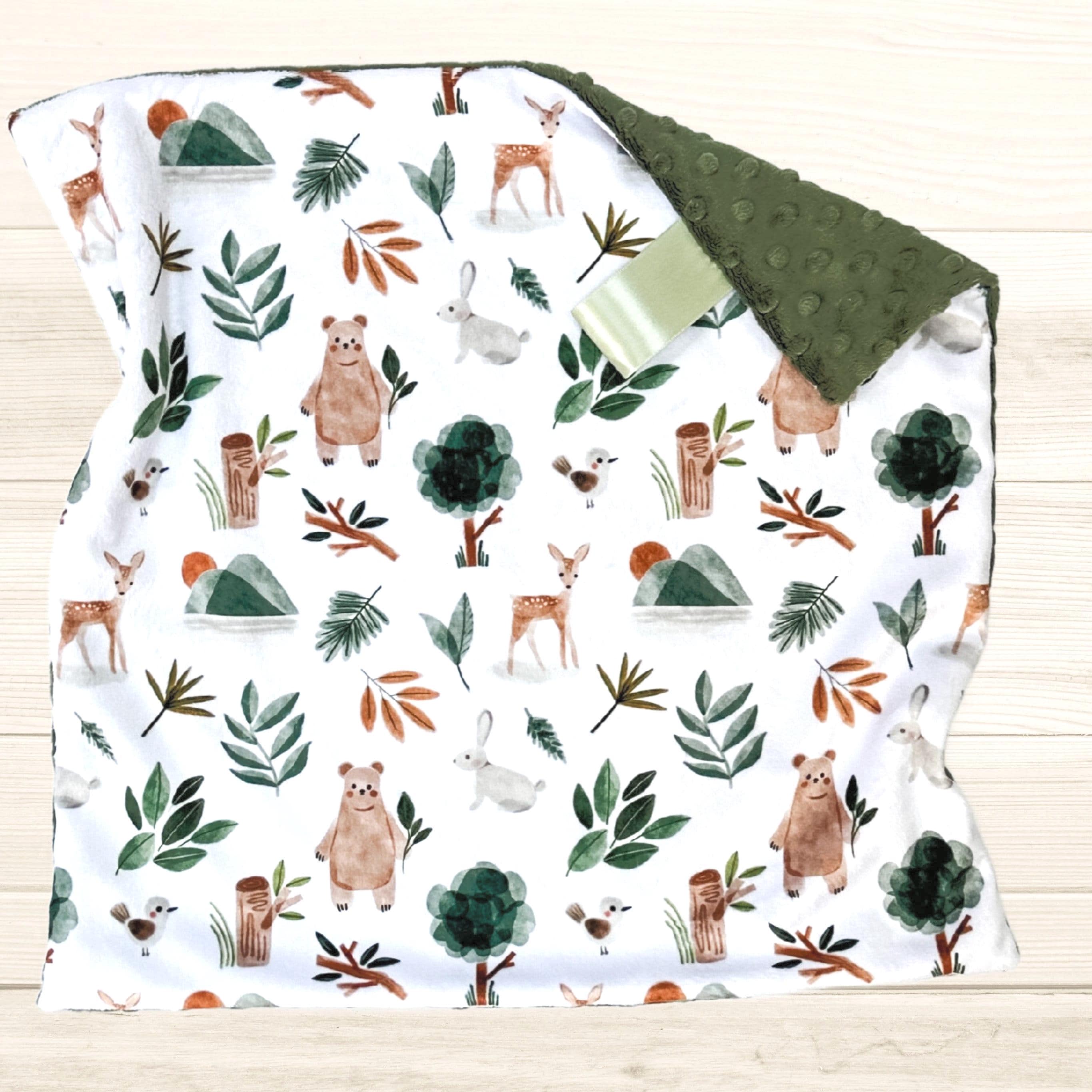 Introducing our Woodland Animals Lovey Baby Blanket, a delightful companion for your little one for wherever they go. This enchanting blanket features adorable woodland animals, such as a bear, bunny, fawn, and bird, creating a whimsical woodland nursery decor. Crafted with love and attention to detail, this sweet little security blanket will quickly become you little ones "can't be without" favorite snuggle blanket.  Our Cute Woodland Animals Lovey Baby Blanket is the perfect gift to welcome a new arrival and add a touch of nature-inspired charm to their world.