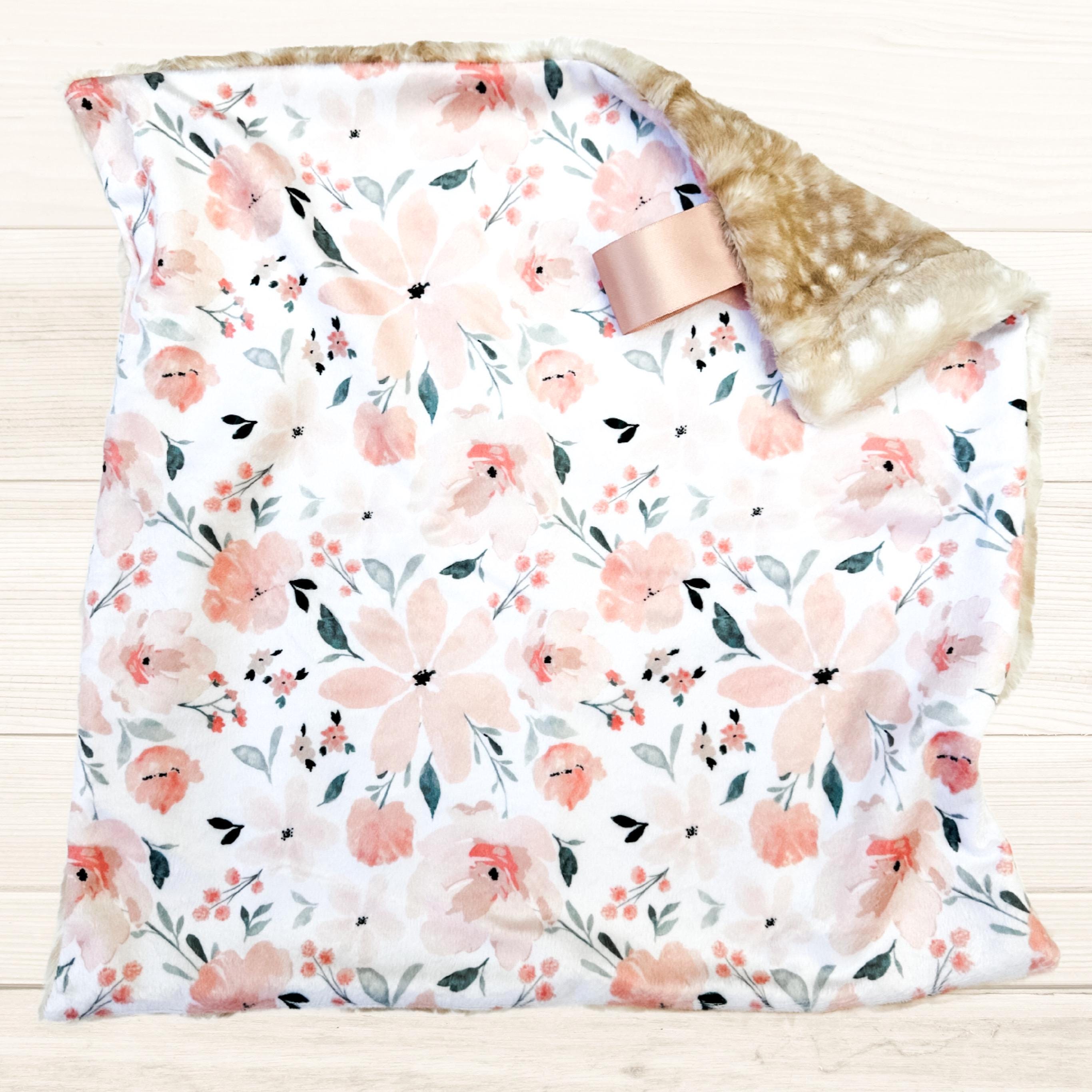 This beautiful floral baby blanket is in soft muted shades of mauve and a silvery green.  This blanket is made from a soft and cozy minky material and a plush faux fur backing.  Our blankets are amazingly soft and luxurious yet light enough for summer.