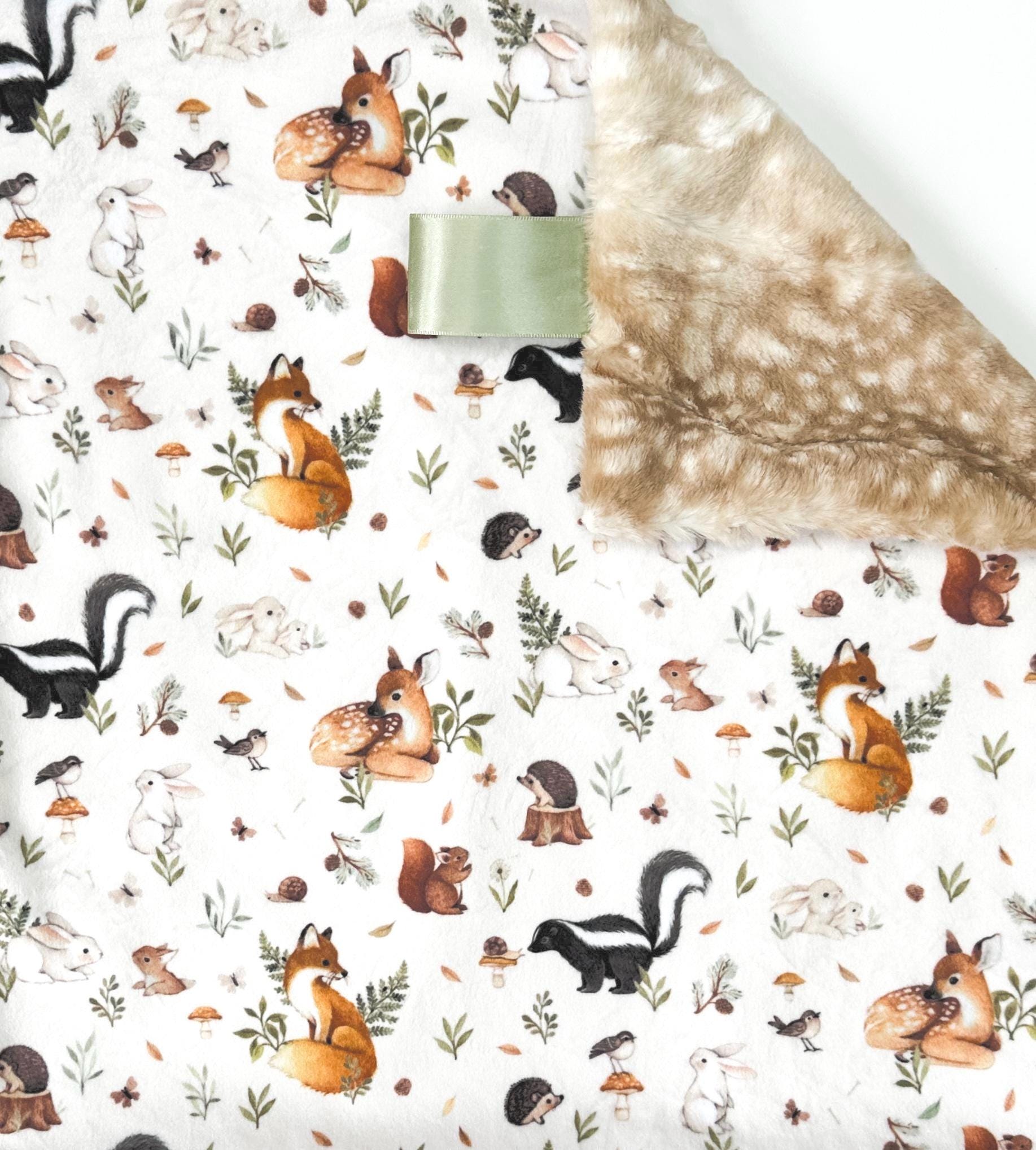 Introducing our Woodland Animals Lovey Baby Blanket, a delightful companion for your little one for wherever they go. This enchanting blanket features adorable woodland animals, such as foxes, bunnies, deer, hedgehogs, and skunks, creating a whimsical woodland nursery decor. Crafted with love and attention to detail, this sweet little security blanket will quickly become you little ones "can't be without" favorite snuggle blanket. Our Cute Woodland Animals Lovey Baby Blanket is the perfect gift to welcome a new arrival and add a touch of nature-inspired charm to their world.